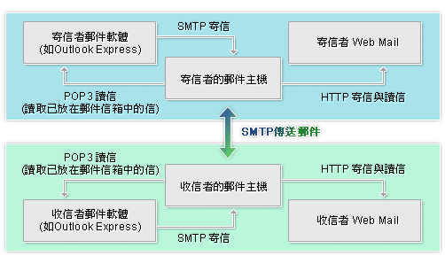 另外,當使用者透過郵件收發軟體(如Outlook Express)想要讀取存放在郵件主機信箱中的郵件,就必須透過另外一個通訊協定POP3,POP3的全名是Post Office Protocol, Version 3,將郵件全數下載至使用者電腦中,然後才能閱讀信件。如果要寄信,仍舊必需使用SMTP協定將郵件上傳至郵件主機中,不過,現在這部接受上傳的郵件主機將成為代理遞送(SMTP Relay)的主機,因此必需確認上傳者的身份,此處的SMTP主機與郵件收發軟體之間採用的是增強安全性的SMTP協定(SMTP Service Extension for Authentication),可以比對上傳者的ID與Password,以確認有沒有外寄郵件的權限。