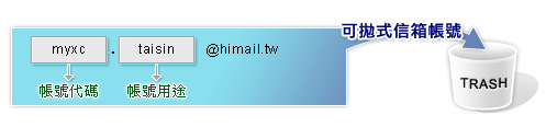 這樣帳號 myxc.taisin@himail.tw 您可以用來專門與taisin公司往來之用,如果有一天,您發現這個帳號開始收到垃圾信了,您可以合理懷疑是taisin公司把您的帳號洩漏出去,為了避免困擾,您可以將這個帳號拋棄,這樣垃圾信就不會再找上您了。