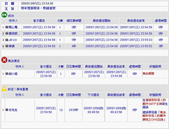 您一定有過這樣的經驗,重要的電子郵件寄送出去了,對方遲遲沒有收到,也不知道發生了什麼狀況,向ISP反應,也只得到「我們會請工程師查看看再回覆」的回應,有時,一等就是好幾天,甚至石沉大海;不然就是要等到退信,才看到一堆不甚了解的說明。難道,電子郵件系統就不能讓我們在線上查詢目前mail遞送的狀況嗎?現在很多國際快捷公司都提供貨件追蹤系統,讓民眾查看託送物品目前已經送到那裡了;到ATM提款或轉帳,領不出錢或轉帳不成,也會出現錯誤訊息,例如:餘額不足、轉入帳號有誤…,讓您清楚知道發生了什麼問題。