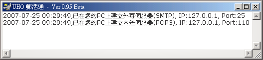 記錄視窗就會顯現出來,通常剛啟動的UHO記錄視窗第一行,是目前建立在您的電腦上的通訊伺服器的IP與PORT資訊: